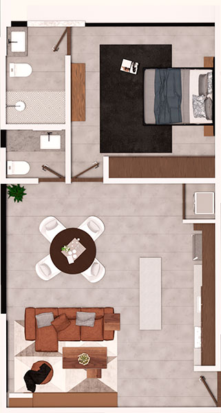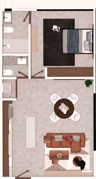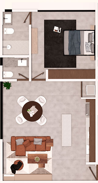 Desde 64.65 m2 interiores, desde 5.95 m2 de terraza techada, 12 m2 de estacionamiento privado no techado.